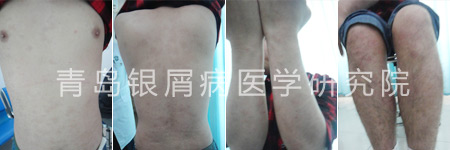 病史主诉:患者7年前不明原因于背部出现指尖大小红色斑丘疹,上表覆盖白色鳞屑,并于前胸、手臂和腿部逐渐出现类似症状。皮损面逐渐扩大融合,患者无自觉症状,患者在7年间接受过多家大型综合医院诊治,治疗期间使用大量口服西药和激素类药膏,病情虽有好转,但总是反复发作,随后的3年间越来越严重。患者于2014年2月13日来成都银康银屑病医院就诊。